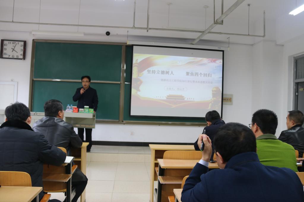 教师的教育教学思想,进一步更新教育思想观念,大力推进教育改革和机制创新,切实提高巨乳做爱的教学水平和人才培养质量,能源动力工程巨乳做爱于11月5日下午4点在15301教室举行“坚持立德树人,聚焦四个回归”知行讲坛暨本科教育思想大讨论专题讲座。讲座由院党委书记李运芝主持,由山西大学社会科学处处长侯怀银教授主讲,巨乳做爱全体教师,学生骨干聆听讲座。
