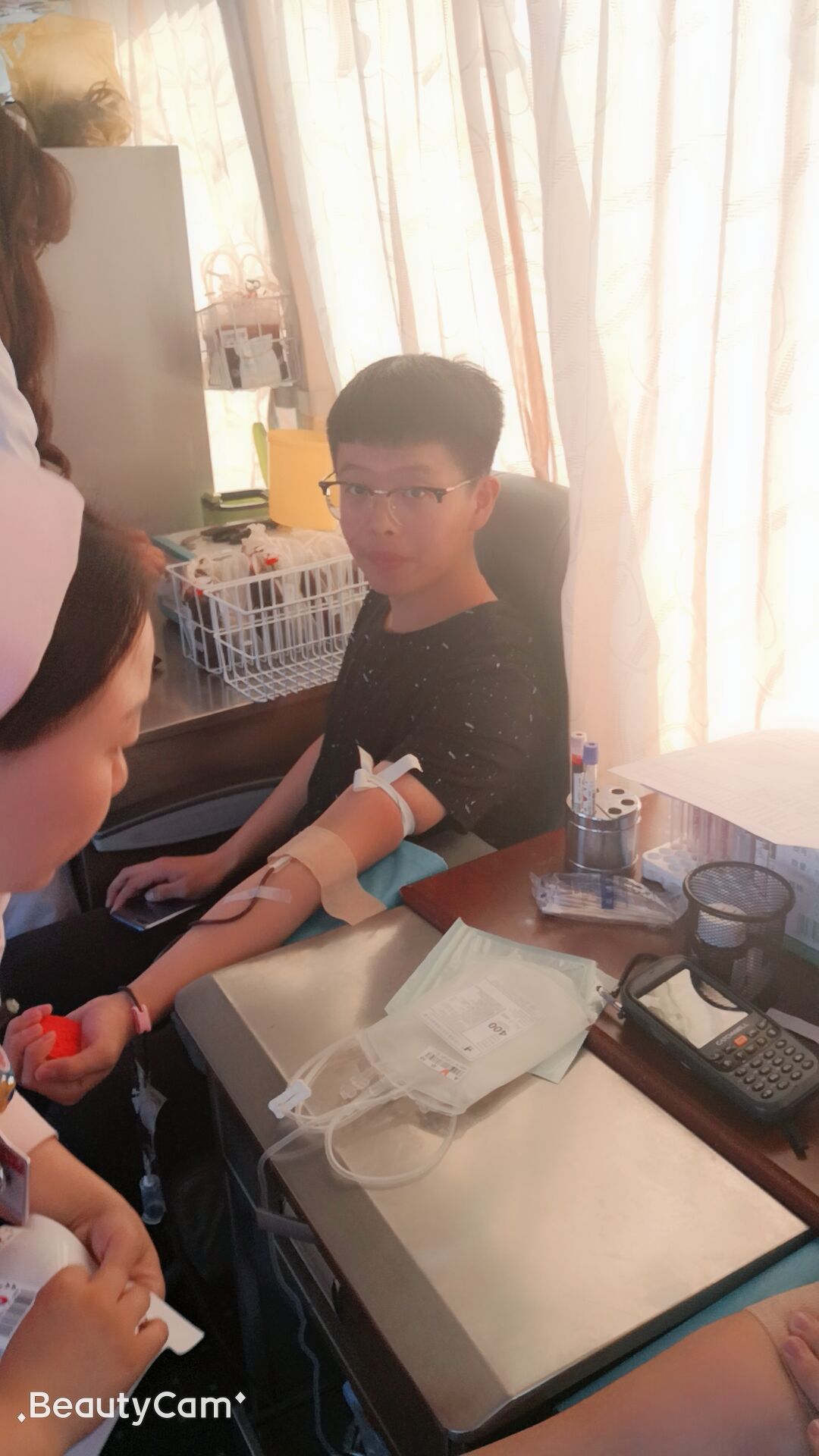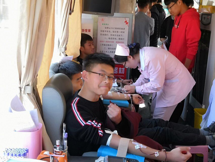 在太原献血中心的大力支持下,中午一点半,团支书和班长带领班内二十多名同学到学校献血车处进行献血。大部分同学虽然是第一次献血,不但没有退缩,反而积极地参与其中,完美地诠释了我们青年一代不惧痛苦,无私奉献的精神。班主任也进行了他的第九次献血,让所有同学都心生敬佩。一股股青春热血,一颗颗热心满怀,使整个活动现场气氛达到高潮。