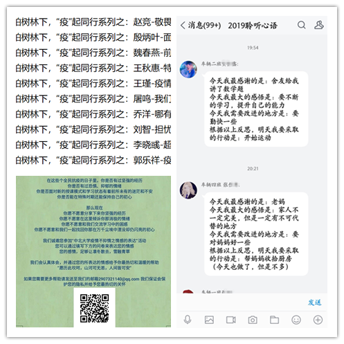 根据学校疫情防控攻坚期、关键期的会议精神,围绕“稳定学生情绪、坚定学生信念、强化人文关爱、注重心理疏导、引航学生发展”的工作要求,“柏树林下”辅导员工作室积极响应,细致计划,开展系列工作,为师生疫情防控加注“心能量”。