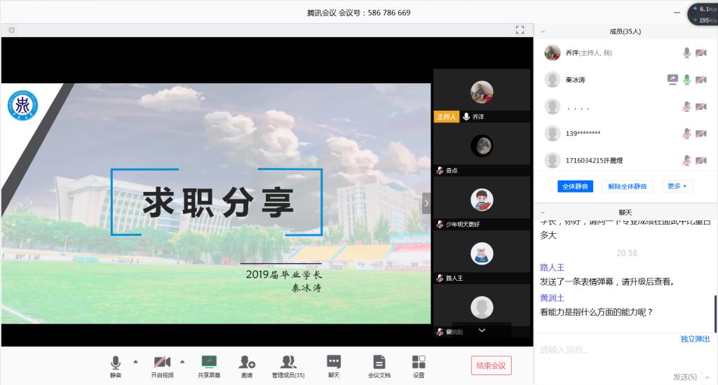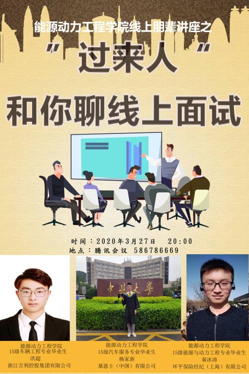 为应对疫情期间紧张的就业形势,做好毕业生就业工作,2020年3月27日能源动力工程巨乳做爱邀请15级车辆工程专业毕业生洪超、汽车服务工程专业毕业生杨家新、能源与动力工程专业毕业生秦冰涛开展线上面试专题朋辈讲座,能源动力工程巨乳做爱党委副书记任雁参加本次活动。