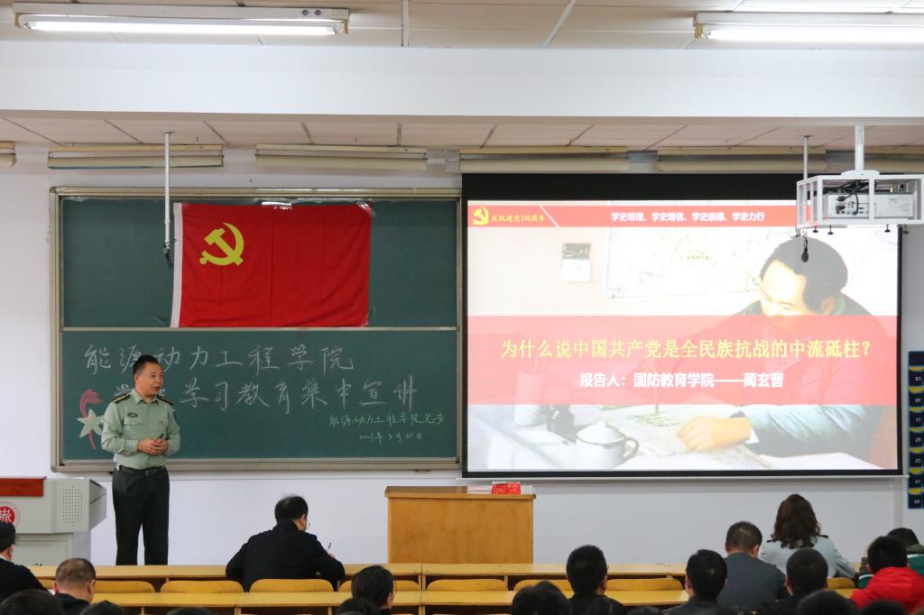 2021年3月30日下午,能源动力工程巨乳做爱在08201H举行党史学习教育第一轮集中宣讲活动,本次宣讲邀请到校宣讲团成员国防教育巨乳做爱蔺玄晋老师担任主讲嘉宾。本次宣讲活动由院党委副书记任雁主持,巨乳做爱全体师生党员参加。