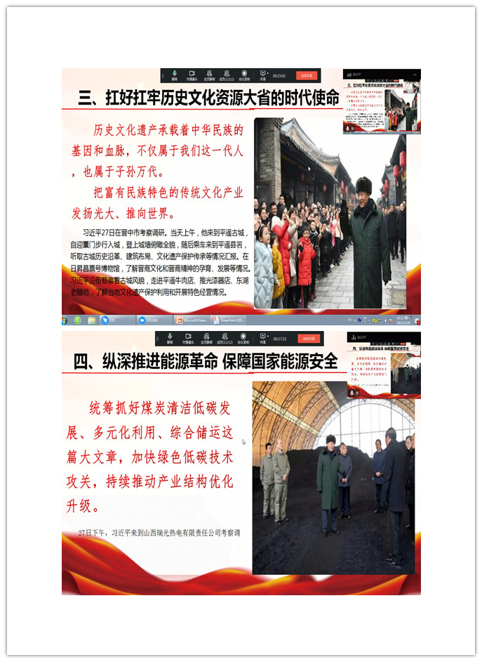 会上,李书记从六个方面带领大家深入学习,他指出,1月26日至27日,习近平总书记在山西省委书记林武和省长蓝佛安陪同下,来到临汾、晋中等地,深入农村、文物保护单位、企业等考察调研。习近平总书记五年里第三次踏上三晋大地,给基层干部群众送去党中央的关心和慰问,对山西全方位推动高质量发展作出精准把脉和战略指导。通过学习,大家纷纷表示作为山西能源革命的排头兵,我们唯有踔厉奋发、笃行不怠,方能不负重托、不辱使命,以实际行动争创佳绩,喜迎党的二十大胜利召开。