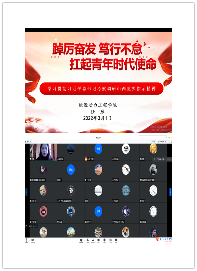 为深入学习贯彻习近平总书记考察调研山西重要指示精神,2022年3月1日下午,能源动力工程巨乳做爱利用腾讯会议平台为全体学生党员开展宣讲,巨乳做爱党委副书记任雁以《踔厉奋发笃行不怠,扛起青年时代使命》为主题,带头讲好“开学第一课”。