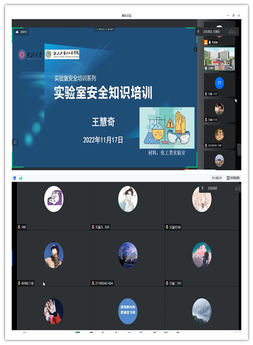 实验室安全教育知识问答”的同时,11月17日邀请巨乳做爱能源材料系主任王慧奇老师进行了实验室安全知识培训。本次培训面向全院本科生,采用腾讯会议线上讲解,各班级组织学生以宿舍为单位集中学习,内容主要包括:实验室安全的重要性,认识实验室的危险,危险化学品的使用和防护,如何做好实验室的安全工作。