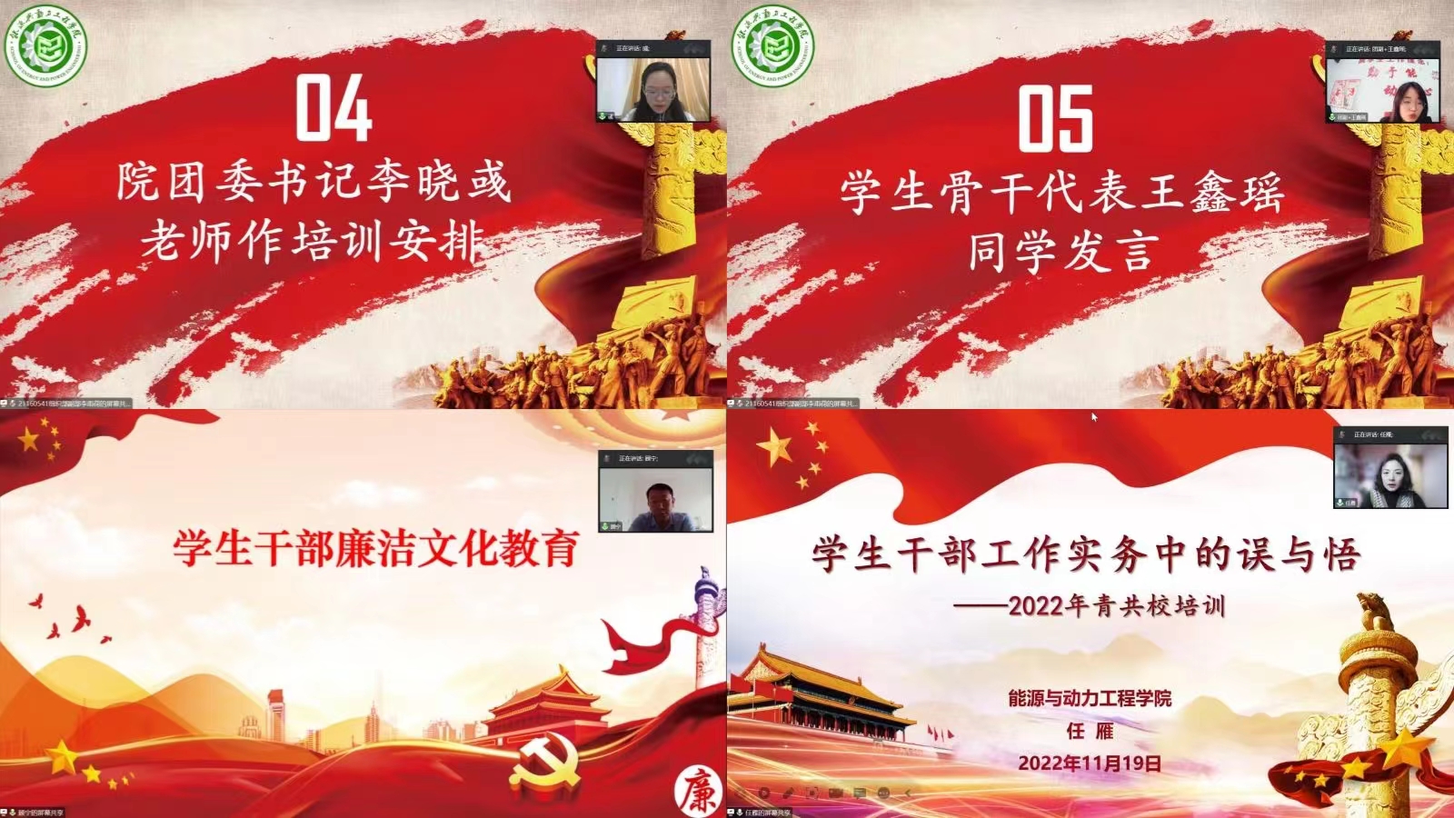 于11月19日全天开展了青共校培训,各学生组织副部及以上学生干部,2021、2022级各班团干共计200余人参加了培训,此次培训通过腾讯会议进行。