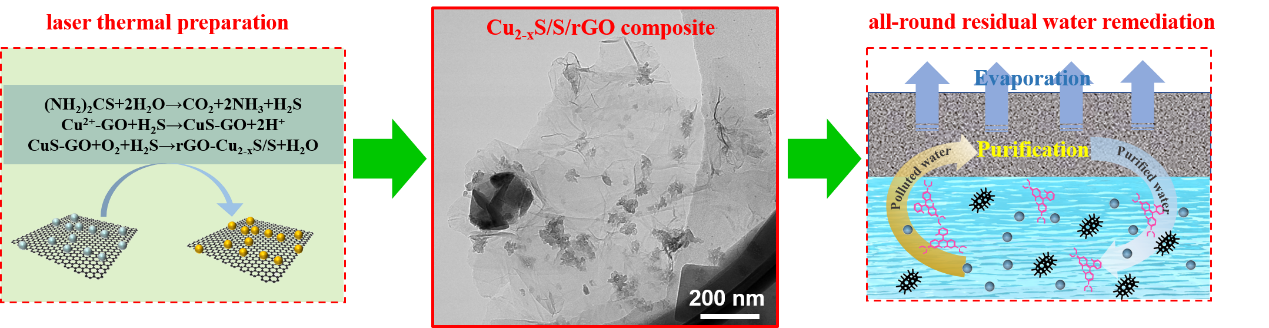 论文主要报道了一种简单的激光热制备Cu2-xS/S/rGO纳米复合材料的方法,该纳米复合材料可实现界面太阳能水蒸发过程中污水的全方位综合治理与净化。将吸附有Cu2+的氧化石墨烯纳米片分散于硫脲水溶液中,在激光辐射下,可快速制备得到Cu2-xS/S/rGO纳米复合材料。与氧化石墨烯纳米片相比,制备的Cu2-xS/S/rGO纳米复合材料具有良好的光热和光催化性能,界面太阳能水蒸发速度可达2.58 kg•m-2•h-1。将Cu2-xS/S/rGO纳米复合材料与氧化石墨烯纳米片共混后,可实现光热、光催化和吸附性能的有机协同,在界面太阳能光热水蒸发过程中不仅能够快速制取纯净的蒸馏水,还可以高效地去除残余污水中的污染物(罗丹明B、细菌和重金属离子)。同时,由于光催化对污染物的降解作用,光热薄膜同样具有较高的循环使用稳定性。本研究可为制备多功能纳米复合材料,进而利用界面太阳能水蒸发技术实现污水综合治理提供新思路。