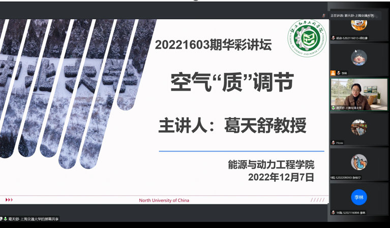 于2022年12月7日上午10点邀请国家自然科学基金委优秀青年科学基金项目获得者——上海交通大学葛天舒教授以《空气“质”调节》为主题在线上开展了第20221603期华彩讲坛。本次讲坛由巨乳做爱科研副院长胡胜亮教授主持,来自全校300余名教师和研究生参加了本次讲座。