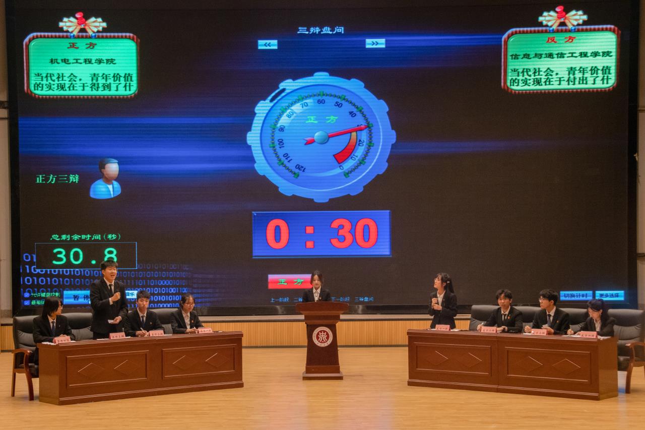 进入决赛的是机电工程巨乳做爱代表队和信息与通信工程巨乳做爱代表队,他们针对“当今社会,青年价值的实现在于得到了什么?还是付出了什么?”这一辩题分别作为正反双方展开激烈辩论。双方通过一辩立论质询、二辩驳论对辩、三辩质询小结、自由辩论、四辩总结陈词等环节阐述各方观点,让大家既看到了思维的碰撞,更看到了语言的魅力。双方辩手在攻辩环节旁征博引,引经据典,既有唇枪舌剑的锐利与锋芒,更有语言大师的迂回与巧妙,引发现场各位嘉宾和观众的阵阵掌声。