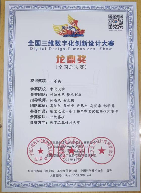 近日,第16届全国3D大赛年度总决赛线上赛事圆满结束,本次大赛采用采用线上答辩/评审+线下会议/颁奖的形式进行。我校行知车队-梦想 10.0团队作品《逸尘之境---基于整车布置优化的休闲赛车》获全国总决赛一等奖。
