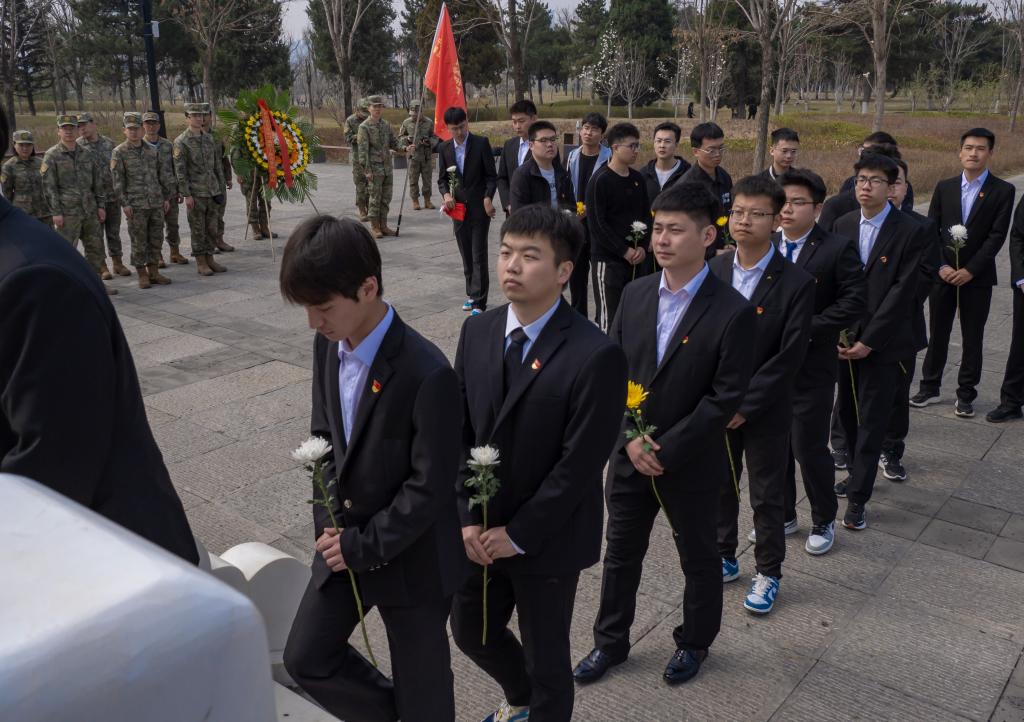 在董昊同志的带领下,大家重温入党誓词,在铿锵有力的宣誓中,全体党员铭记烈士们遗愿,坚定初心使命,获得了思想上的洗礼。学生党员代表万邦宸、王宗辉同志向高君宇烈士塑像敬献花篮,全体师生依次上前献上菊花,并缓步绕行,瞻仰纪念碑。之后,全体师生党员移步解放太原革命烈士墓区,集体擦拭烈士墓碑。