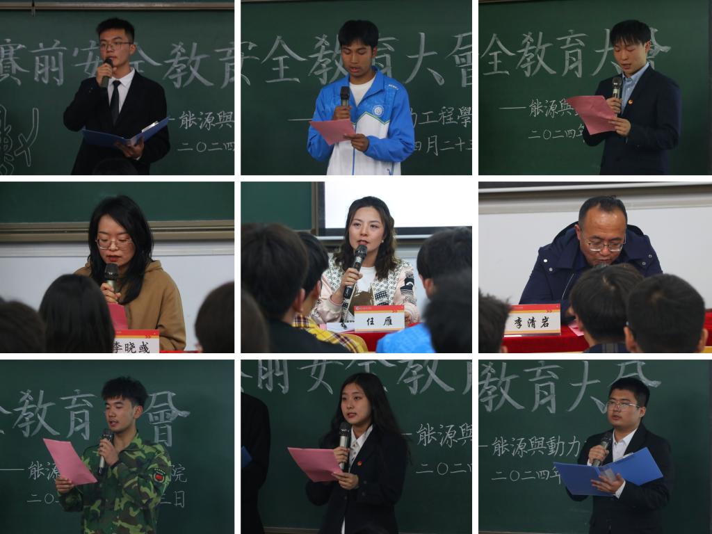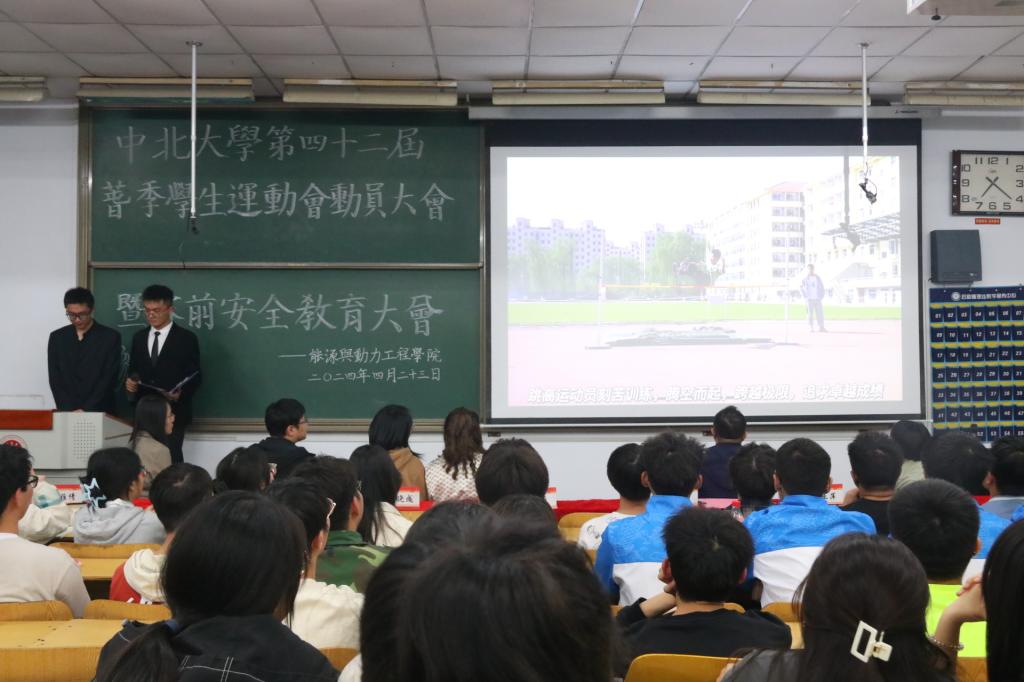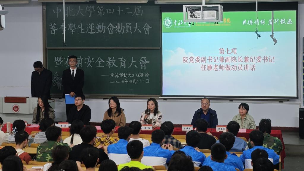 于2024年4月25日下午19:00在08101H教室召开了誓师动员大会暨赛前安全教育大会。院党委副书记兼副院长兼纪委书记任雁老师、院团委书记李晓彧老师、学生科副科长李清岩老师,以及辅导员祈亚萍、李涛、董雅倩老师出席本次大会。本届校运会全体教练员、运动员、方阵队员、军体拳队员以及全体学生骨干参加了大会。本次大会由郝育铭同学主持。